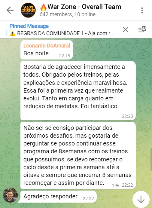 O contato com nosso time pode ser no grupo do desafio ou individualmente pela Plataforma de Treinos, deixando um comentário em qualquer página de treino ou dieta. Para garantir que a sua dúvida seja atendida, ou caso não consiga acompanhar o grupo do Desafio, você deverá deixar suas dúvidas na nossa plataforma de treinos. Após a compra você receberá um Manual de participação, com todos os detalhes de como ter suporte e acompanhamento.